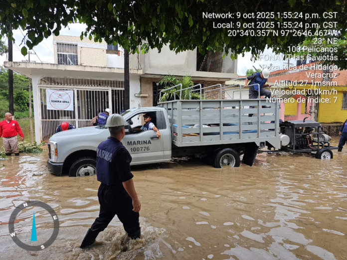 Veracruz, Ver. — En el marco de la implementación del Plan Marina en su Fase de Auxilio, la Secretaría de Marina (Semar), a través de la Armada de México, desplegó personal y equipo especializado para apoyar a la población civil afectada por las intensas lluvias registradas en el norte del estado de Veracruz durante la actual temporada de ciclones y huracanes.