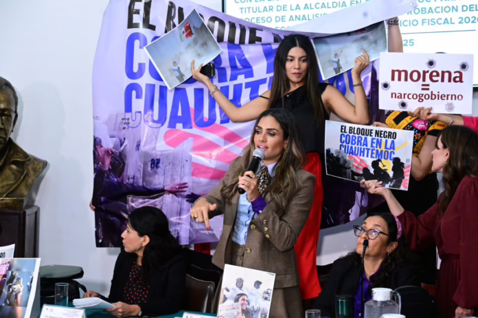 Rojo de la Vega asistió respaldada por comerciantes ambulantes ligados a Rubén Jiménez Barrios, operador priista señalado también de movilizar agremiados a la protesta del sábado. El clima en el salón se tensó entre interrupciones, pancartas y consignas enfrentadas: mientras Morena exhibió lonas con la frase “El bloque negro cobra en la Cuauhtémoc”, el PAN respondió con carteles que decían “Morena = narcogobierno”.