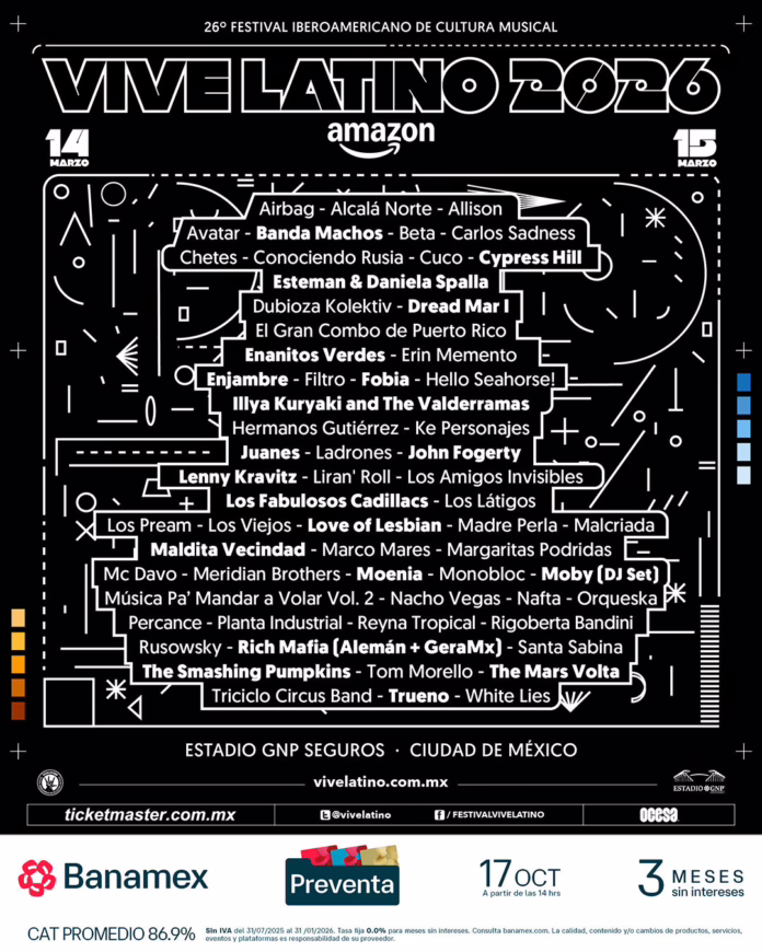 El Vive Latino 2026 ya tiene cartel oficial y promete una de las ediciones más variadas y nostálgicas de los últimos años. El festival se realizará los próximos 14 y 15 de marzo de 2026 en el Estadio GNP Seguros de la Ciudad de México, con la participación de más de 58 artistas nacionales e internacionales.